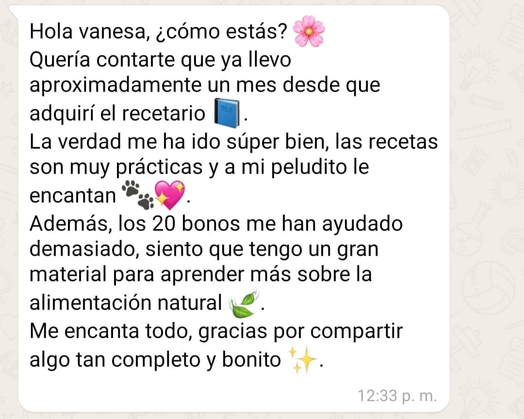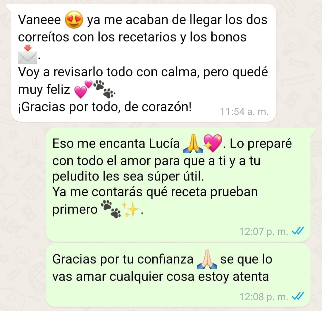 Soy la creadora de los recetarios MÁS AMOROSOS y completos de Colombia para alimentación natural canina. He ayudado a MÁS DE 2,500 FAMILIAS COLOMBIANAS a transformar completamente la salud de sus perros con alimentación casera y natural. Este proyecto nació desde mi deseo PROFUNDO de ayudar a familias que, como TÚ, aman a sus peluditos como hijos y quieren cuidarlos de forma más natural, sin químicos innecesarios ni alimentos ultraprocesados que los están enfermando lentamente día tras día.